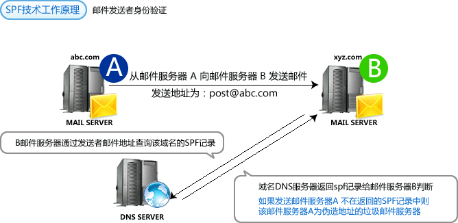 SPF是跟DNS相关的一项技术,它的内容写在DNS的txt类型的记录里面。mx记录的作用是给寄信者指明某个域名的邮件服务器有哪些。SPF的作用跟mx相反,它向收信者表明,哪些邮件服务器是经过某个域名认可会发送邮件的。