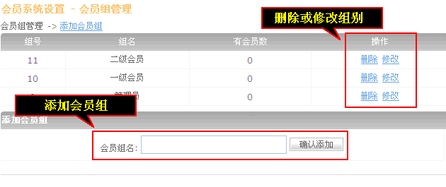 这里可以删除修改会员组,可以添加会员组,输入会员组名后点击“确认添加”。